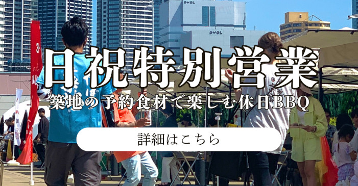 予約食材のご利用で、休市日の日祝や仲卸営業終了後も築地食材で手ぶらBBQをお楽しみ頂けます!特にビアガーデン気分が堪能できる夜プランは、暑い季節におすすめです。完全予約制となりますのでご注意ください。詳細は以下バナーをクリック♪